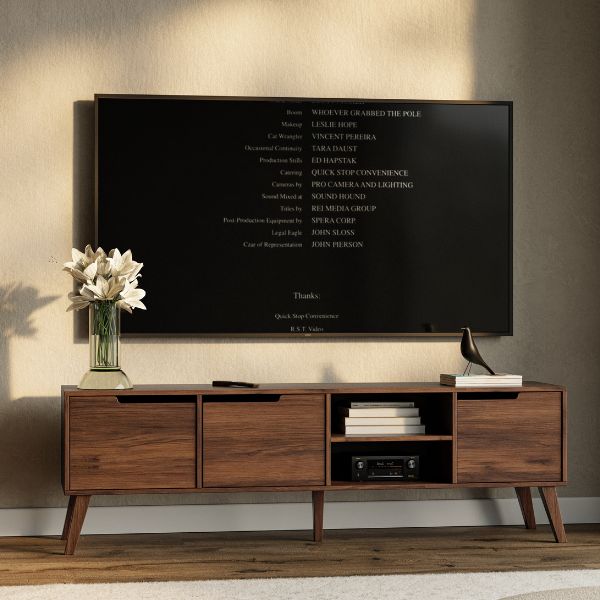 Szafka RTV Nordelo oferuje trzy zamykane szafki oraz praktyczne otwarte półki – idealne na dekodery, konsole czy sprzęt audio.
