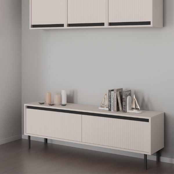 Jej pionowo frezowane fronty w odcieniu beżu piaskowego wprowadzają do wnętrza spokój i harmonię, a czarne akcenty dodają całości nowoczesnego wyrazu.