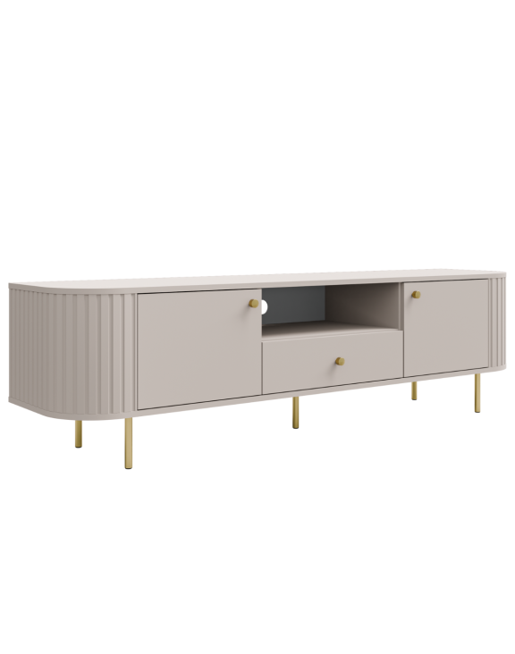 Szafka RTV Ovalio Typ 321 w wybarwieniu beż piaskowy zachwyca subtelną formą, frezowanymi bokami oraz eleganckimi czarnymi detalami.