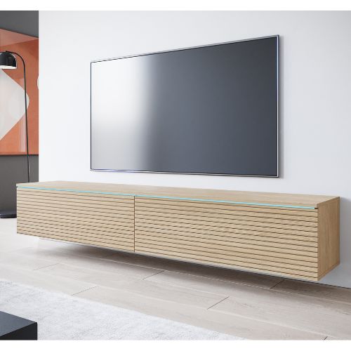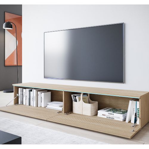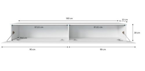 Dwie pojemne klapy otwierane ku dołowi kryją wewnątrz szerokie komory (każda o długości 87,65 cm), które pomieszczą sprzęt RTV, konsole, dekodery czy kolekcję płyt. Wysokość wnętrza 30 cm pozwala na wygodne rozmieszczenie akcesoriów, a szerokość całkowita 180 cm sprawia, że mebel doskonale sprawdzi się pod dużym telewizorem.