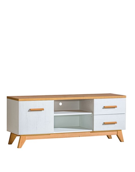 Szafka pod telewizor z kolekcji Sven przyciąga uwagę już od pierwszego spojrzenia. Model utrzymany w kolorystyce sosna andersen, który został przełamany wyrazistymi akcentami w odcieniu dąb nash, które dodają całości charakteru i ciepła.