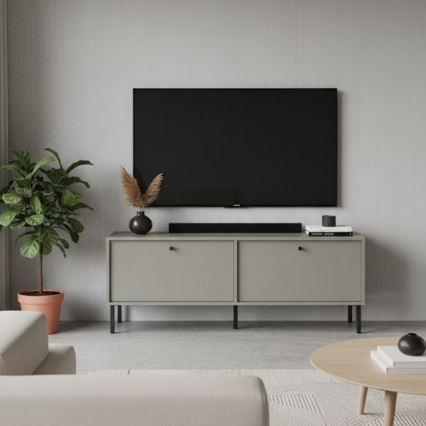 Szafka RTV Tokyo 2 w eleganckim kolorze eukaliptusowym łączy minimalistyczny design z funkcjonalnością, tworząc mebel, który wnosi do wnętrza spokój, harmonię i naturalne piękno.