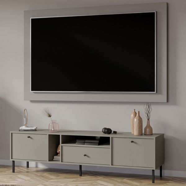Szafka RTV Tokyo 2 w eleganckim kolorze eukaliptusowym łączy minimalistyczny design z funkcjonalnością, tworząc mebel, który wnosi do wnętrza spokój, harmonię i naturalne piękno.