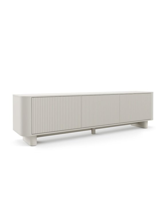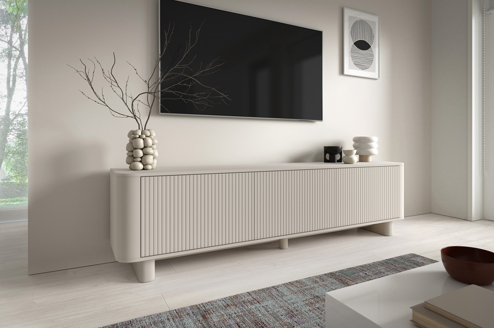 Szafka RTV Trenza 200 cm w kolorze kaszmir w wersji na nóżkach to eleganckie połączenie nowoczesnego designu z ponadczasową formą. Subtelny odcień kaszmiru, ryflowane fronty oraz zaoblone krawędzie tworzą harmonijną bryłę, która doskonale wpisuje się w aranżacje minimalistyczne, japandi i modern classic.