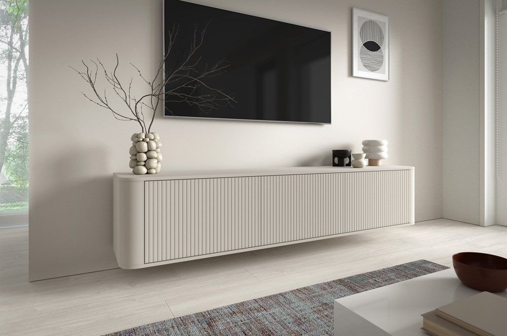Nowoczesna szafka RTV wisząca Trenza 200 cm w kolorze kaszmir to połączenie minimalistycznej elegancji z funkcjonalnością, której oczekujesz w salonie premium. Subtelny, ciepły odcień kaszmiru wprowadza do wnętrza harmonię i ponadczasowy styl, a modne ryflowane fronty nadają meblowi wyjątkowy charakter.