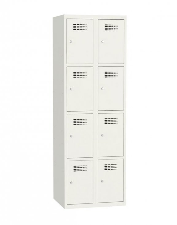 Seria SUS W 324 marki Malow to metalowe szafki z czterema skrytkami na rzeczy osobiste w dwóch kolumnach.