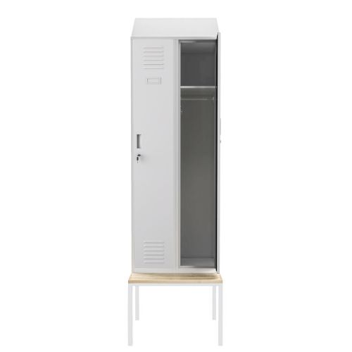 Integralnym elementem mebla jest ławka z wytrzymałym drewnianym siedziskiem, która znacząco podnosi komfort użytkowania, pozwala swobodnie usiąść, zmienić obuwie czy przygotować się do pracy lub treningu.