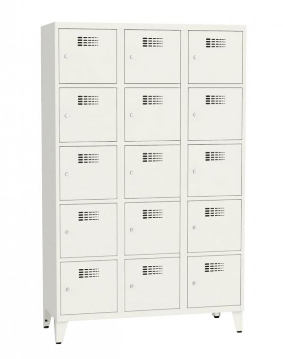 Prezentowane szafki mają moduły o szerokości 40 cm. W jednym module znajdują się pięć komór ubraniowych. Oferowany model posiada trzy moduły. Szafki z większą lub mniejszą ilością skrytek w module można zobaczyć w zakładce Produkty z rodziny.
