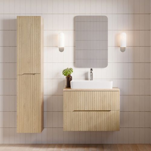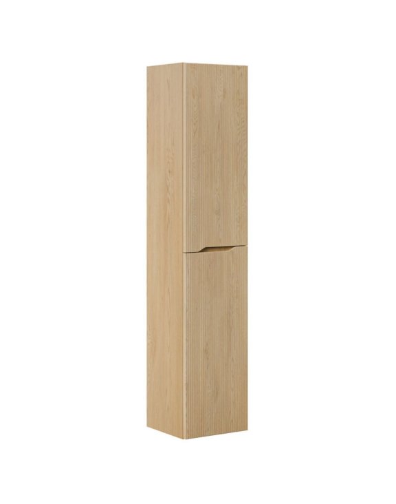 Szafka łazienkowa wisząca, słupek łazienkowy o ryflowanych frontach w kolorze dąb cremona. Model idealny do łazienki w stylu skandynawskim, eko, japandi i nowoczesnym.