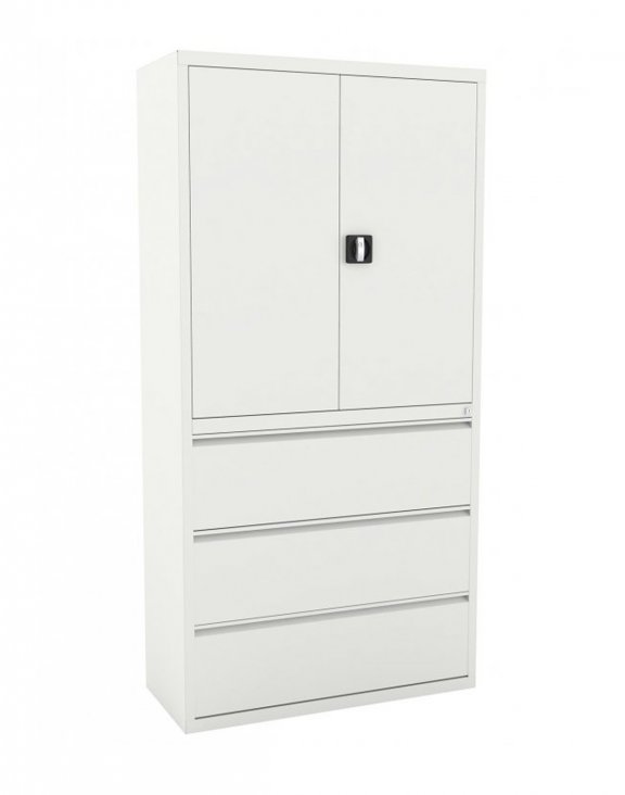 Praktyczne połączenie szafy na segregatory z szufladami na teczki zawieszkowe.