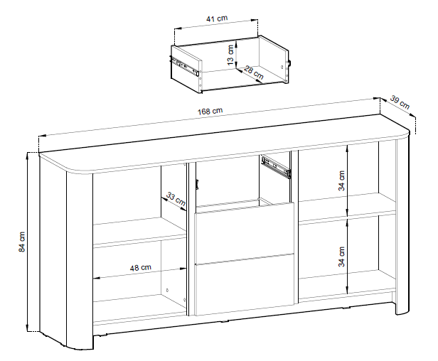Wymiary: szerokość 168 cm, głębokość 39 cm, wysokość 84 cm.
