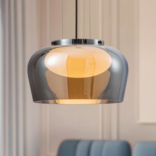 Szklana lampa wisząca z dymionym kloszem to idealny wybór do nowoczesnych wnętrz, w których liczy się klimat i dopracowany detal. Grafitowe, transparentne szkło w połączeniu z czarnym wykończeniem tworzy elegancką, ponadczasową kompozycję, która przyciąga wzrok zarówno w dzień, jak i po zmroku.