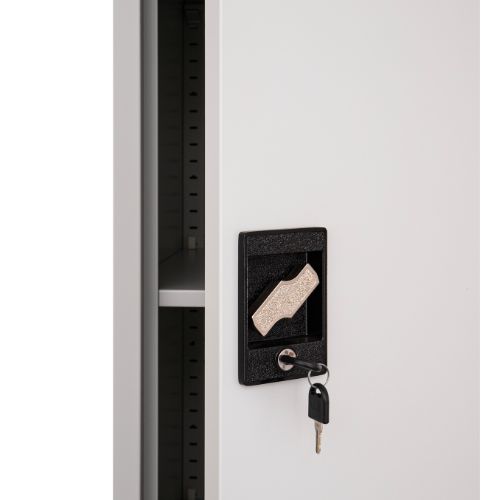 Stabilne drzwi wyposażone są w solidny zamek krzywkowy z kluczykiem, który skutecznie zabezpiecza zawartość szafy, zapewniając pełną poufność i ochronę przechowywanych danych. Każdy detal – od ergonomicznego uchwytu, po starannie wykończone krawędzie – został zaprojektowany z myślą o intensywnym, codziennym użytkowaniu w środowisku pracy.