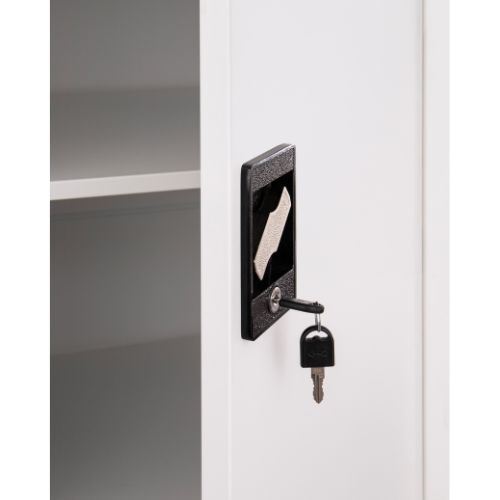 Stabilne drzwi wyposażone są w solidny zamek krzywkowy z kluczykiem, który skutecznie zabezpiecza zawartość szafy, zapewniając pełną poufność i ochronę przechowywanych danych. Każdy detal – od ergonomicznego uchwytu, po starannie wykończone krawędzie – został zaprojektowany z myślą o intensywnym, codziennym użytkowaniu w środowisku pracy.