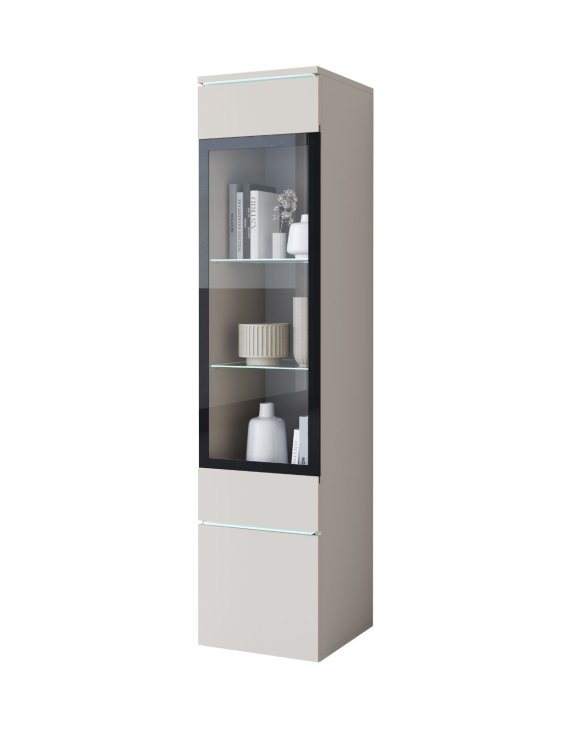 Kaszmirowa wąska witryna Vera z oświetleniem LED. Smukła forma w połączeniu z eleganckim kaszmirowym kolorem, sprawia, że mebel prezentuje się lekko i prestiżowo, a jednocześnie stanowi wyrazisty element aranżacji.