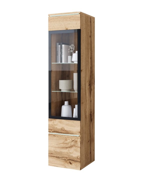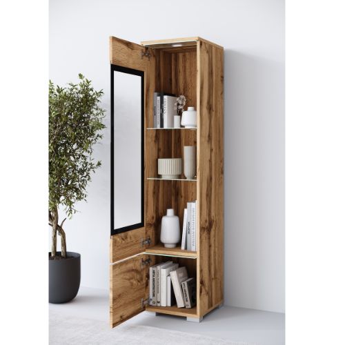 Wąska witryna słupek Vera z oświetleniem LED. Smukła forma w połączeniu z eleganckim dębowym kolorem, sprawia, że mebel prezentuje się lekko i prestiżowo, a jednocześnie stanowi wyrazisty element aranżacji.