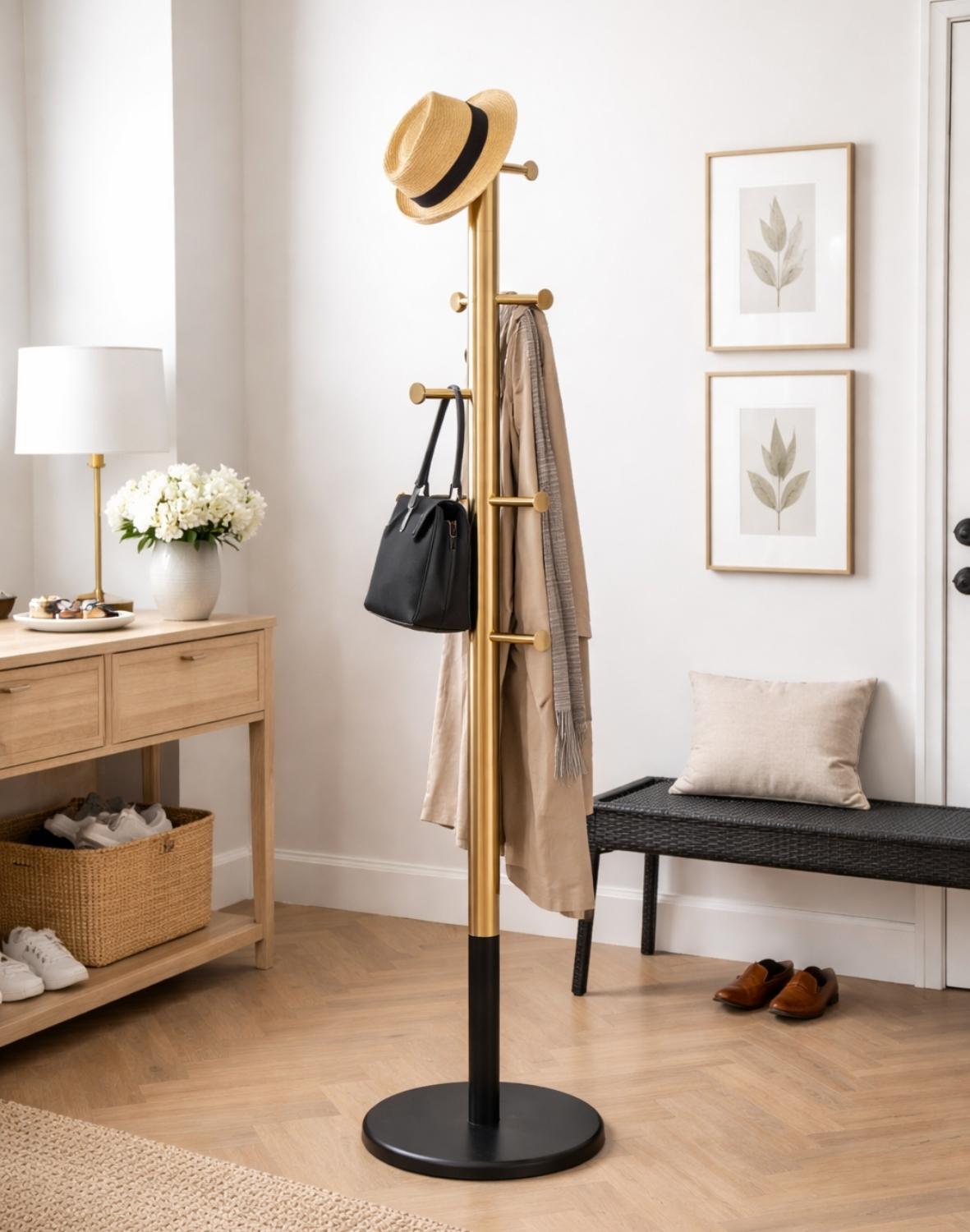 Czarno-złote wykończenie nadaje wieszakowi nowoczesny, klasyczny styl z akcentem glamour, który łatwo dopasować do różnych aranżacji wnętrz - od przedpokoju przez garderobę aż po sypialnię lub pokój gościnny.