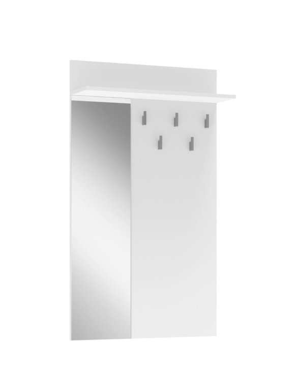 Wykonany z trwałej płyty meblowej laminowanej i wyposażony w lustro, wieszak nie tylko ułatwia organizację codziennych akcesoriów, ale również optycznie powiększa przestrzeń wejściową.
