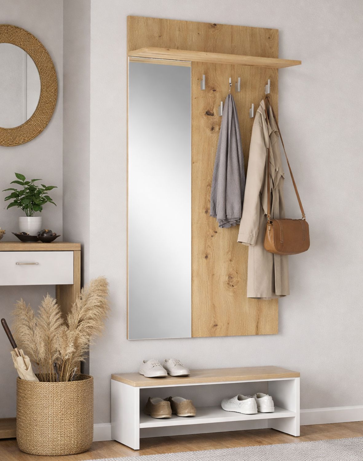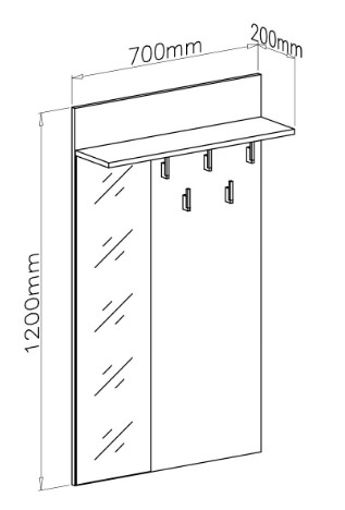 Wykonany z trwałej płyty meblowej laminowanej i wyposażony w lustro, wieszak nie tylko ułatwia organizację codziennych akcesoriów, ale również optycznie powiększa przestrzeń wejściową.
