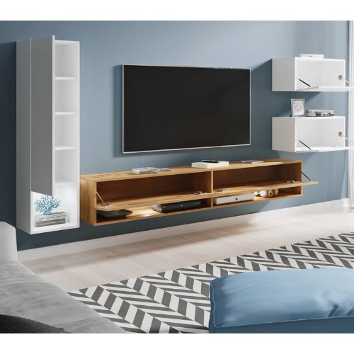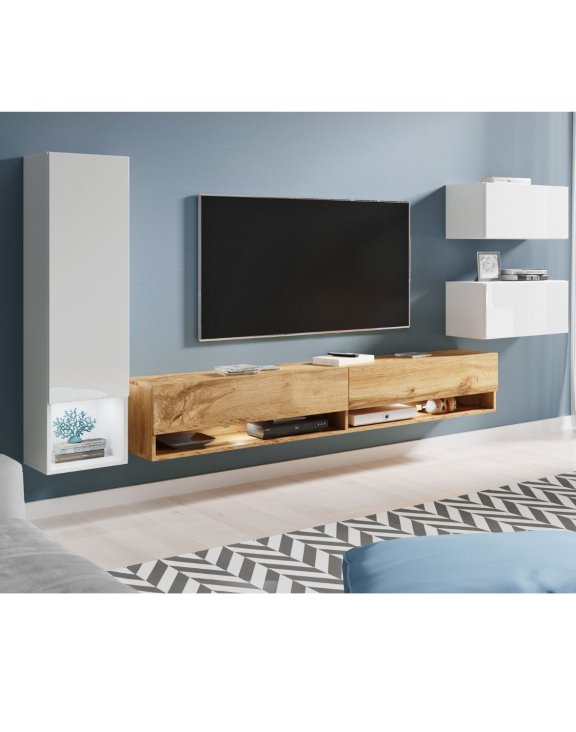 Zestaw składa się z kilku funkcjonalnych elementów, które razem tworzą harmonijną kompozycję na ścianie telewizyjnej.