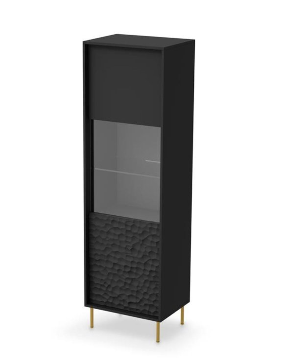 Czarny kolor witryny nadaje jej wyrafinowanego wyglądu, tworząc zarazem kontrastowy i harmonijny efekt w wystroju pomieszczenia. Dekor 3D w formie wgłębień na froncie dodaje meblowi niepowtarzalnego charakteru, nadając mu głębi i nowoczesnego wrażenia.