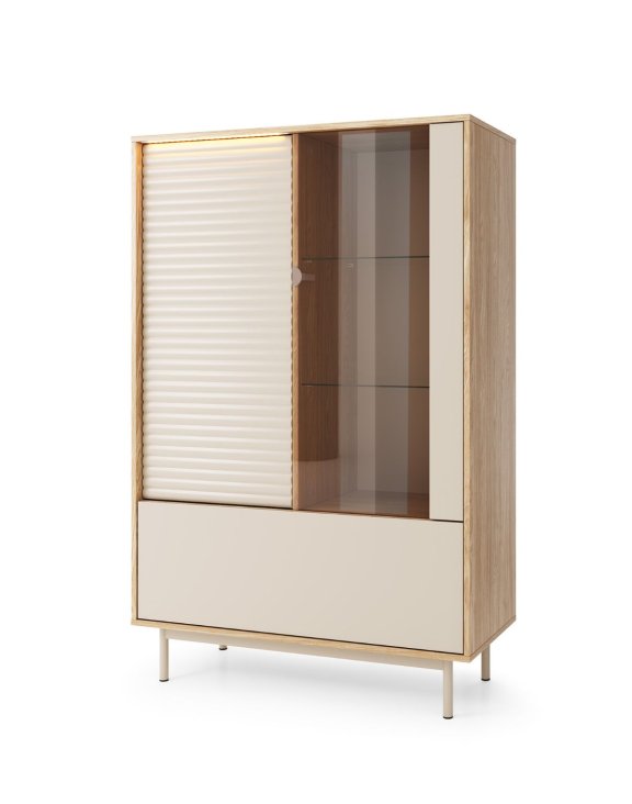 Front mebla został podzielony na trzy strefy: pionowy segment zamykany efektowną ryflowaną płytą w kolorze kaszmirowym, elegancka przeszklona witryna oraz dolna szafka na zawiasach opuszczanych w dół.