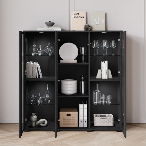 Szklane półki podkreślają nowoczesny charakter mebla i wprowadzają do wnętrza wizualną lekkość, jednocześnie oferując solidne i bezpieczne miejsce do przechowywania.