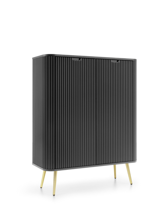 Wysoka komoda stoi na solidnych metalowych nóżkach, dostępnych w dwóch wersjach kolorystycznych: czarnych lub złotych, dzięki czemu można dopasować ją do różnych stylów wnętrz.