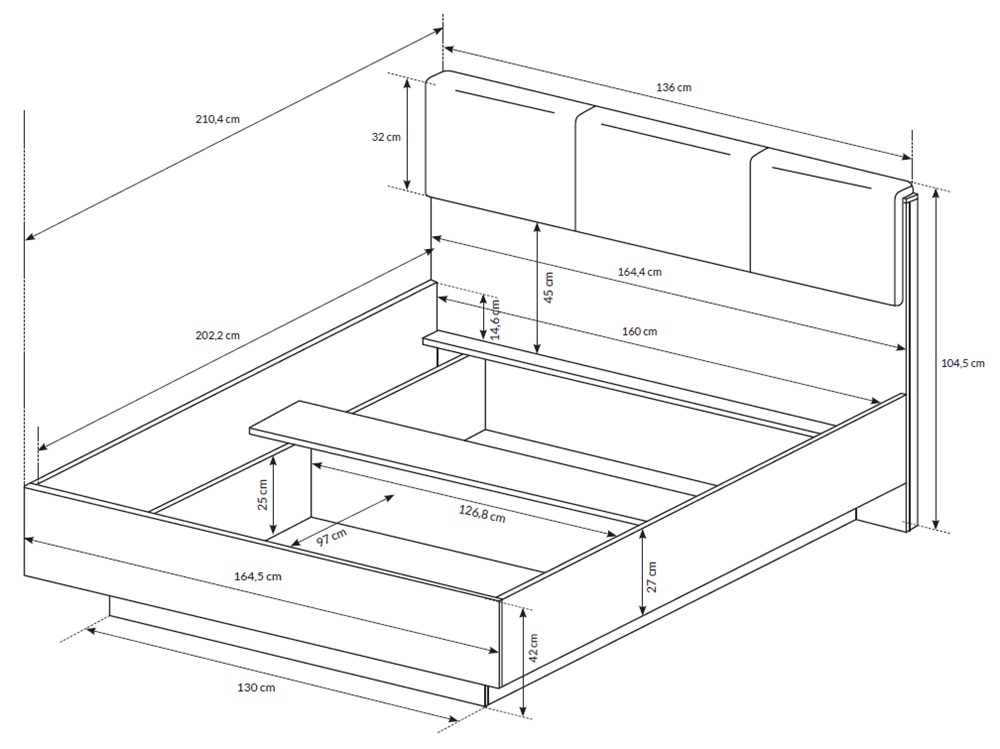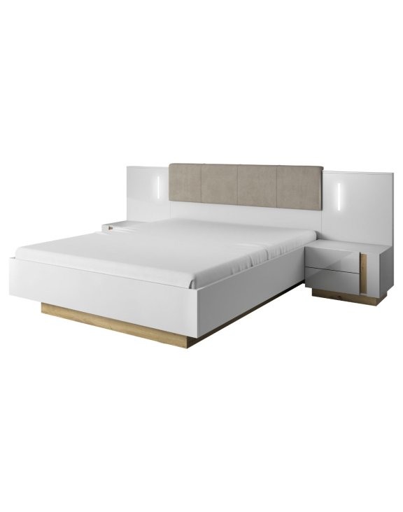 Zestaw Arco N+O – łóżko 160×200 z pojemnikiem + stoliki nocne z LED biały połysk/dąb grandson