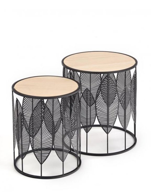 Niezbędny jako dodatek do wnętrz w stylu boho, za sprawą motywu florystycznego, jaki tworzy metalowy stelaż stolików, imitujący liście.