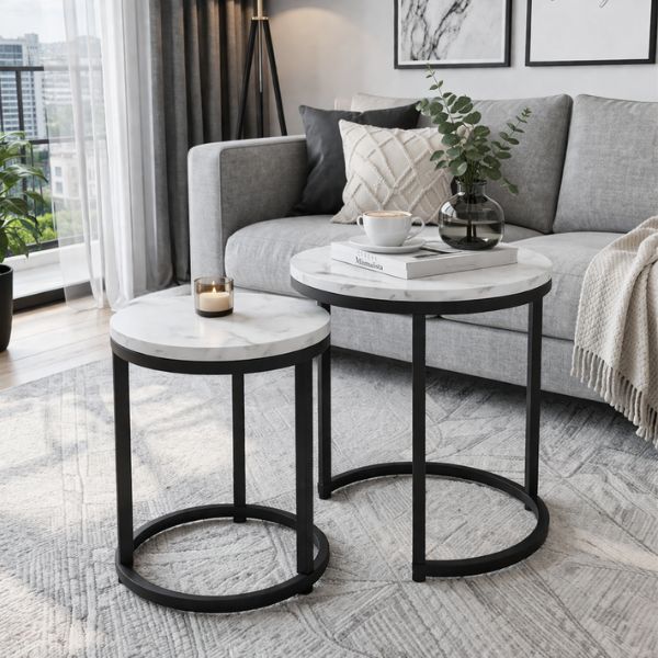 Dwa stoliki o różnych rozmiarach można ustawić razem lub osobno – w zależności od potrzeb.