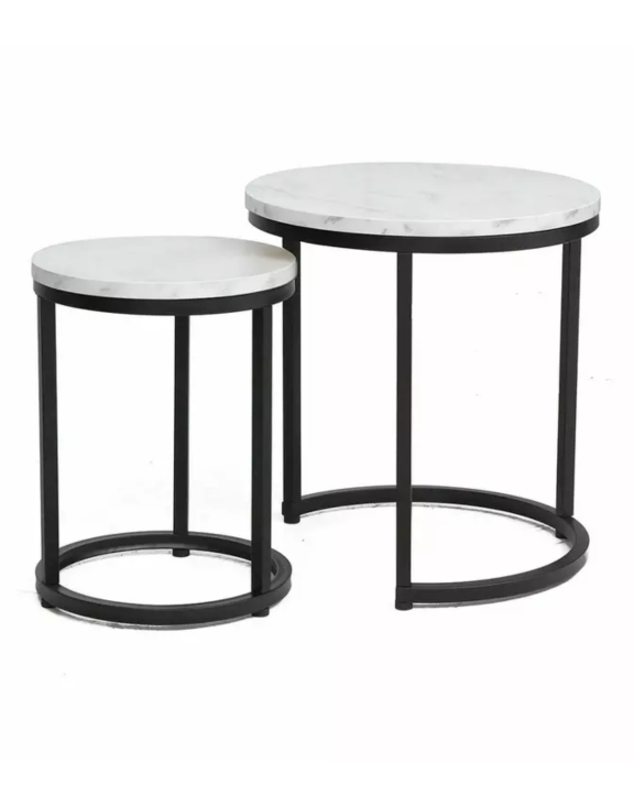 Okrągłe blaty z efektem marmuru w połączeniu z metalowym stelażem tworzą stylowy komplet, który doskonale wpisuje się w aranżacje glamour, loftowe oraz minimalistyczne.
