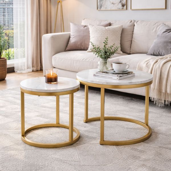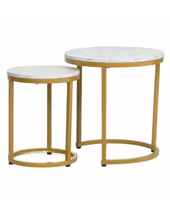 Okrągłe blaty w kolorze białego marmuru w połączeniu z metalowym, złotym stelażem tworzą stylowy komplet, który doskonale wpisuje się w aranżacje glamour, loftowe oraz minimalistyczne.