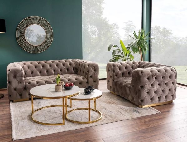 Większa i mniejsza ława zostały zaprojektowane tak, aby można je było częściowo wsunąć jedna pod drugą, co pozwala elastycznie dopasować układ do przestrzeni – razem tworzą efektowną kompozycję centralną, a ustawione osobno sprawdzą się jako stoliki pomocnicze.
