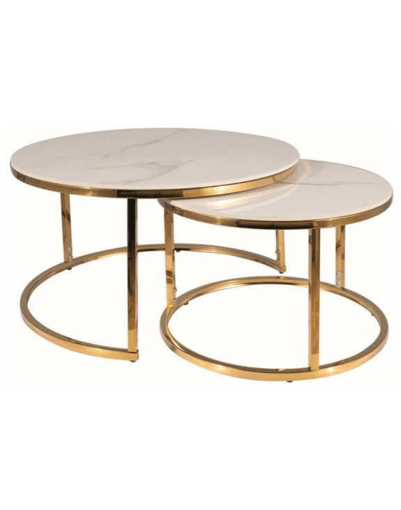 Blaty w odcieniu białego marmuru z subtelnym rysunkiem nadają całości wyrafinowanego charakteru, a złota, połyskująca podstawa w formie geometrycznych obręczy podkreśla lekkość i nowoczesną formę mebla.