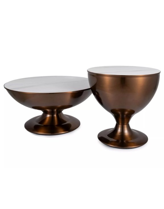 Blaty z ceramiki o efekcie białego marmuru oraz metalowy stelaż w miedzianym połysku tworzą luksusowy akcent, który podkreśli charakter Twojego salonu lub przestrzeni wypoczynkowej.