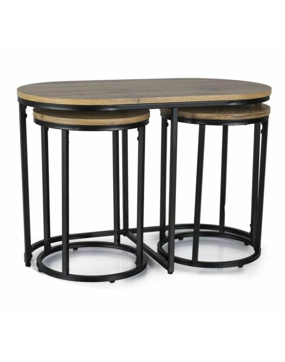 Komplet składa się z większej, owalnej ławy oraz dwóch mniejszych, okrągłych stolików, które można wsunąć pod blat główny.