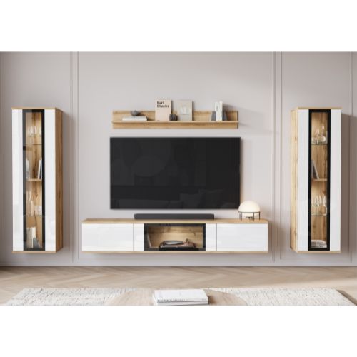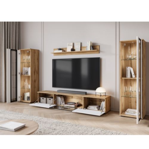 Zestaw modułowych mebli do salonu Caro z przeszkleniami w kolorze dąb wotan w połączeniu z białym połyskiem, z dwoma możliwościami montażu: wiszącym lub stojącym.