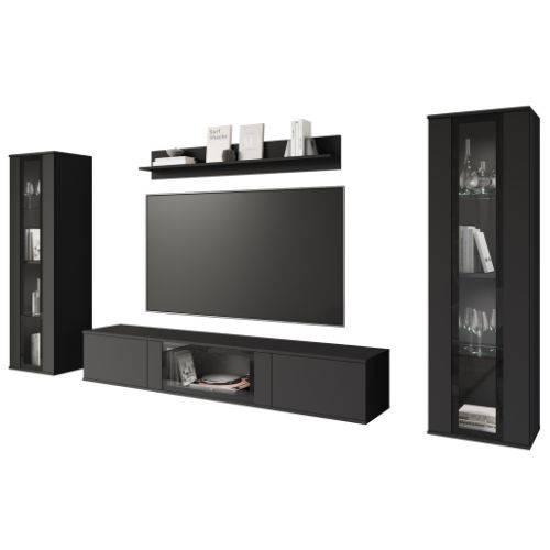 Zestaw modułowych mebli do salonu Caro z przeszkleniami w czarnym kolorze, z dwoma możliwościami montażu: wiszącym lub stojącym.