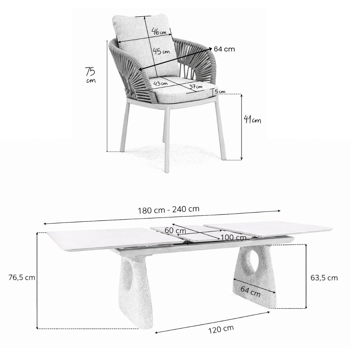 Centralnym elementem zestawu jest rozkładany stół o wymiarach 180/240 × 100 × 76 cm, który pozwala wygodnie pomieścić większą liczbę gości.