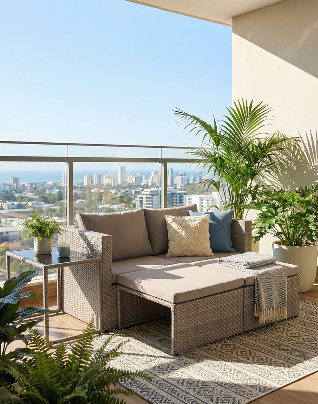 Komplet łączy estetykę naturalnego rattanu z wysoką odpornością na warunki atmosferyczne, dzięki czemu doskonale sprawdzi się na tarasie, balkonie oraz w ogrodzie.