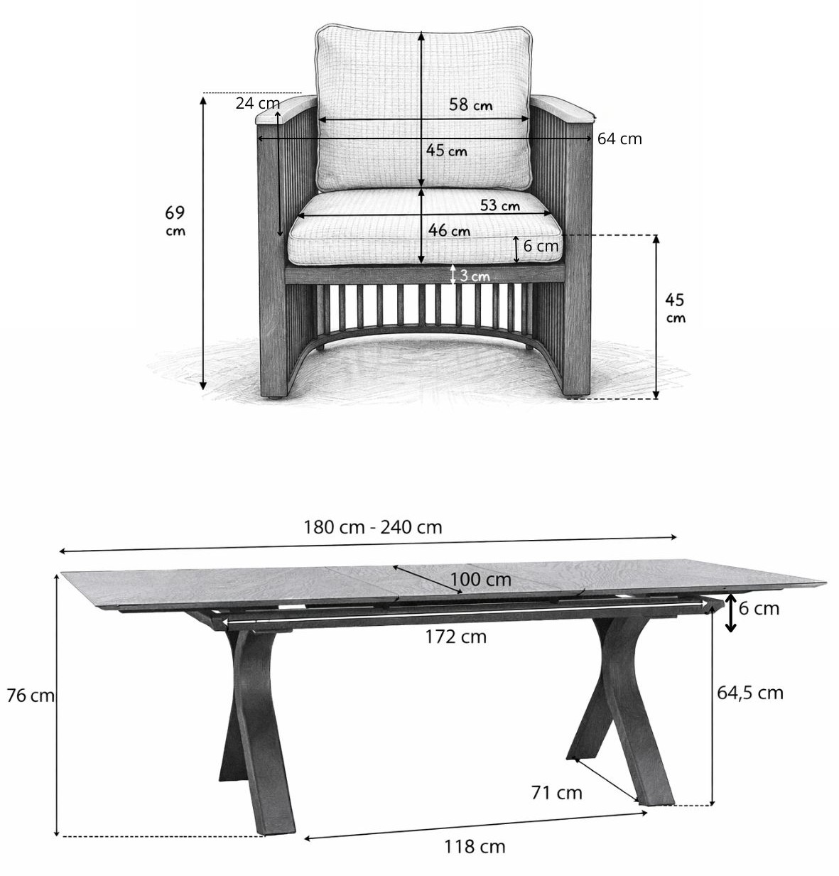 Centralnym elementem zestawu jest funkcjonalny, rozkładany stół o wymiarach 180/240 × 100 × 76 cm, który z łatwością dopasowuje się do liczby gości.