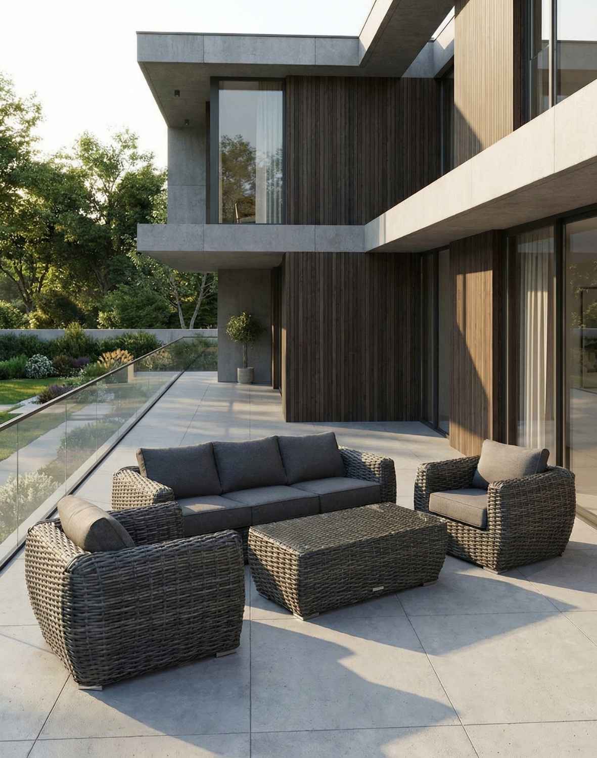 Dodatkowo, grube poduszki w kolorze grafitowym z poliestru zapewniają nie tylko komfort, ale także kontrastują z wiklinowymi elementami, dodając głębi i charakteru całej kompozycji.