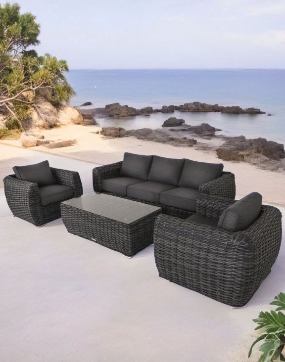 Korfu składa się z czterech elementów - dwóch foteli, trzyosobowej kanapy i stolika kawowego ze szklanym blatem (wykonany ze szkła hartowanego). Zestaw ten oferuje doskonałą przestrzeń do relaksu i spotkań na tarasie czy w ogrodzie.