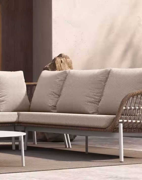Oparcie narożnika zostało wykonane ze splotu naśladujący sznurek w kolorze naturalnym, emanuje elegancją oraz przyjemnością użytkowania. Jego konstrukcja z grubego 7 mm technorattanu zapewnia wyjątkową trwałość oraz łatwość czyszczenia.