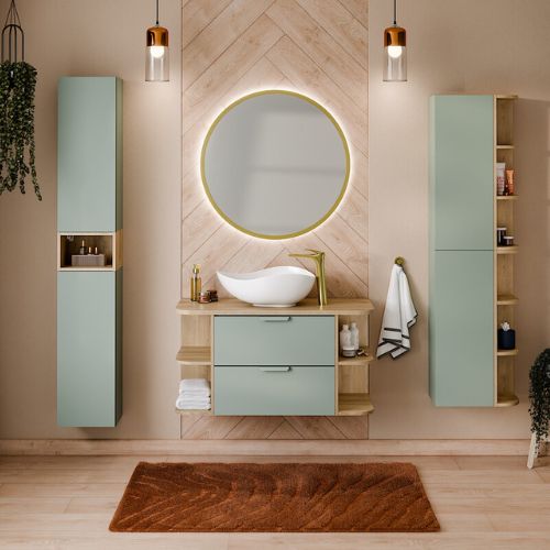 Zielona szafka łazienkowa 100 cm z blatem w zestawie, jest idealnym i nowoczesnym rozwiązaniem do nowoczesnych i naturalnych aranżacji łazienek.