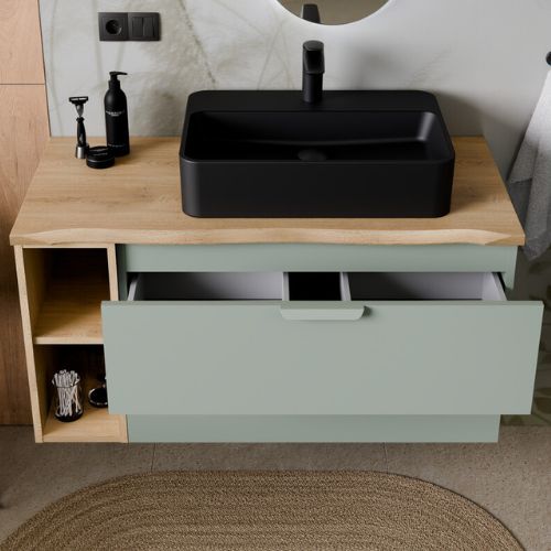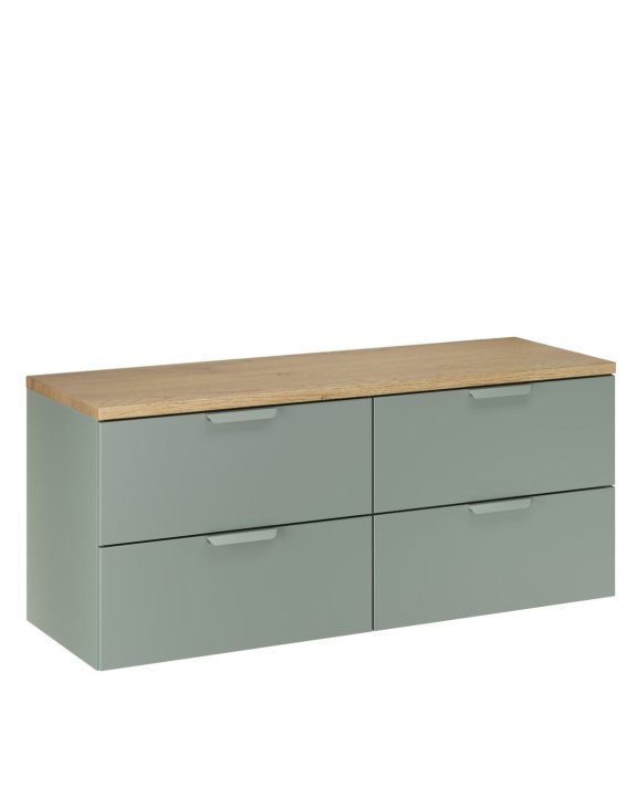 Zielona szafka łazienkowa 120 cm z blatem w zestawie, jest idealnym i nowoczesnym rozwiązaniem do nowoczesnych i naturalnych aranżacji łazienek.
